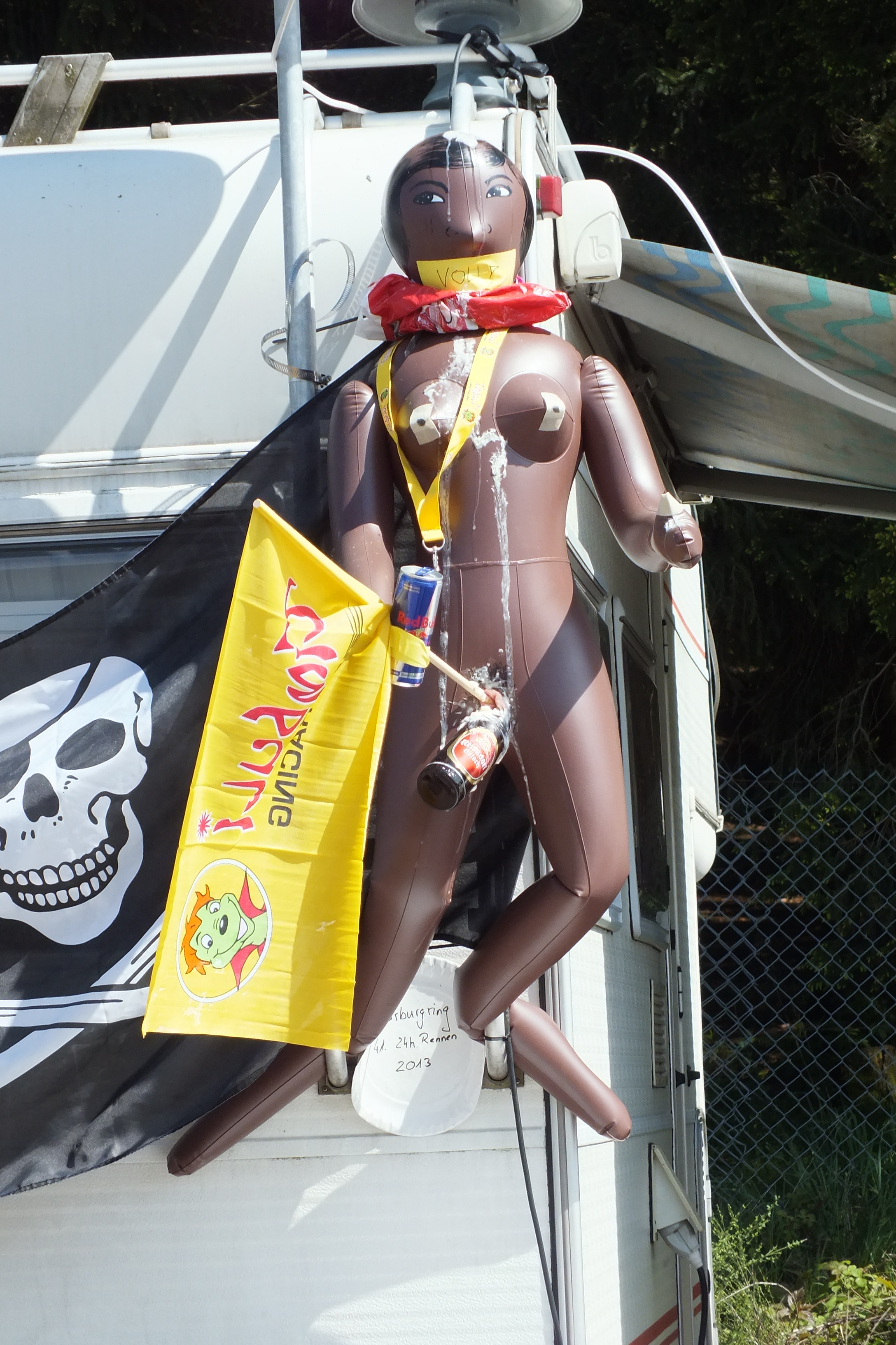 Gummiepuppen sind ein beliebter Dekorationsgegenstand, dieser hat man eine Bierflasche eingeführt. Schön hier.