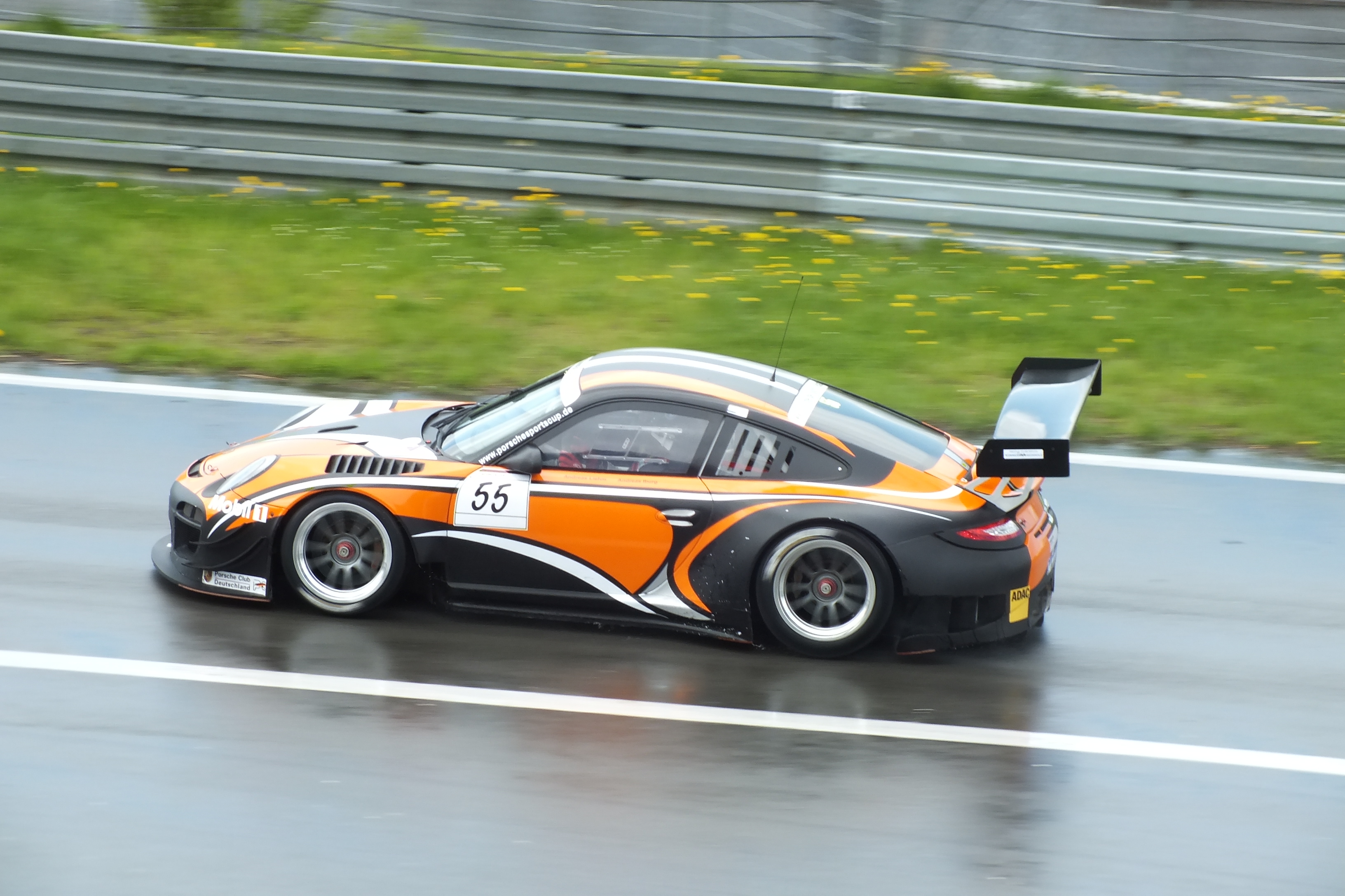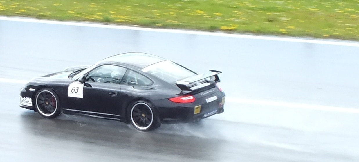 Ich bade in Porschemodellen, die meisten im Renntrimm. Wie im Rausch fotografiere ich verschiedene Details. Die Regentropfen auf dem Lack sehen wunderschön aus. Boxen und Boxengasse sind offen.